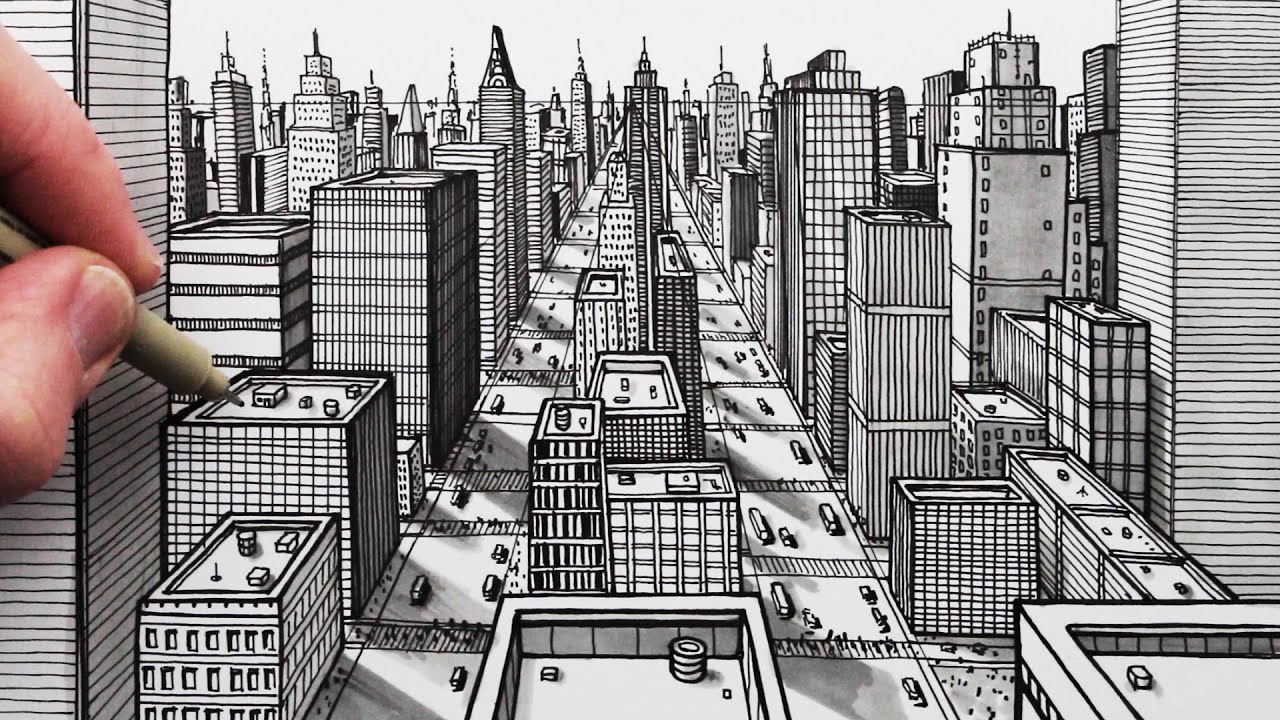 How to Draw a City using 1Point Perspective Pen Drawing YouTube